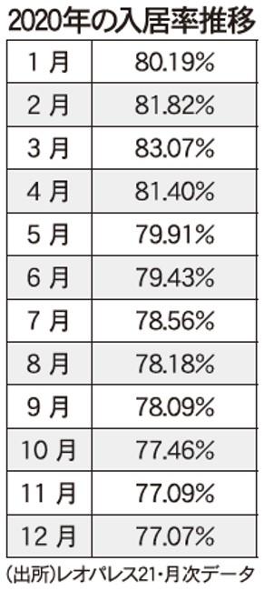 20年3月に83%台まで回復していた入居率は、コロナショックで流れが一変。企業の転勤・研修見合わせなどの影響が響き、4月を境に入居の半数超を占める法人契約などが減った。