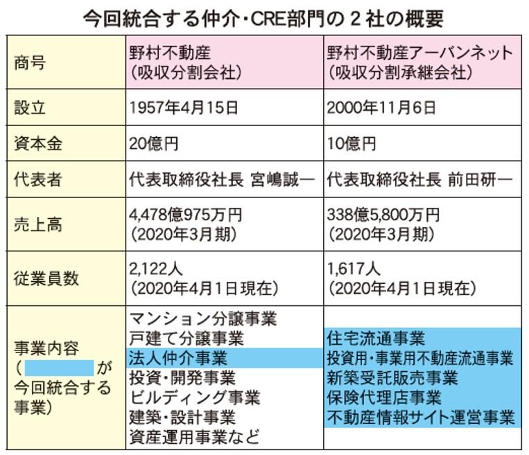 野村不動産グループ、仲介・CRE部門を統合 野村不動産グループ その他|2021年02月17日 野村不動産グループ(東京都新宿区)は、4月1日付で、グループ内の仲介・CRE部門を統合し、新会社「野村不動産ソリューションズ」を発足する。今後は、法人仲介事業と住宅流通事業、新築受託販売事業、保険代理店事業などを1社体制で推進していく計画だ。 同グループの仲介・CRE部門は、野村不動産(同)と野村不動産アーバンネット(同)の2社体制で展開してきた。今回、野村不動産の法人営業本部を、不動産情報サイト『ノムコム』や不動産売買事業の『野村の仲介+(PLUS)』を展開する野村不動産アーバンネットへ統合するとともに、同社の社名を変更する。