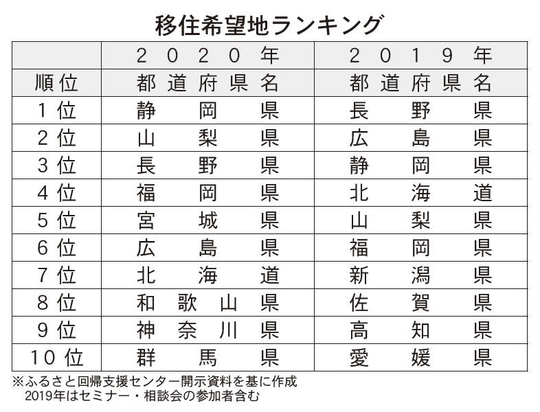 20年度の「移住希望地ランキング」窓口相談者編の上位は、1位が静岡県、2位は山梨県、3位は長野県、4位は福岡県だった。一方で、都市部周辺の地域も新規にランクインしており、都市周辺にはリモートワークによる移住、その他の地域では現地で就業するパターンが多い。