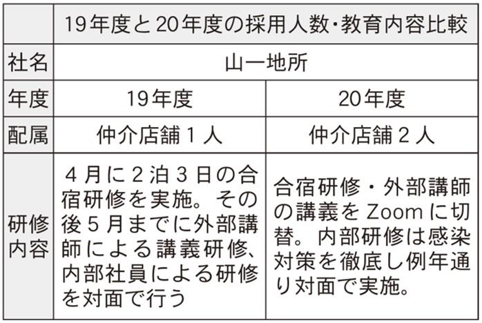 コロナ禍の新人教育 ~後編~ 山一地所, 長栄, 三春情報センター, アイレントホーム その他|2021年04月24日 コロナ下において、不動産会社はどのような新入社員研修を行ってきたのか。2020年の新入社員研修への新型コロナウイルスの影響と環境変化にどう対応したかを各社に取材。21年にはどのような手法をとっていくのかを聞いた。 新入社員の機微把握できず 山一地所、感染対策の上対面実施 「不安感拭えなかった」 管理戸数1万1630戸の山一地所(宮城県仙台市)では、20年度の新人教育は、リモートと対面を併用して行った。対面の研修時には感染対策をして行ったが、「対策は十分なのか不安がぬぐえなかった」と渡部洋平社長は振り返る。