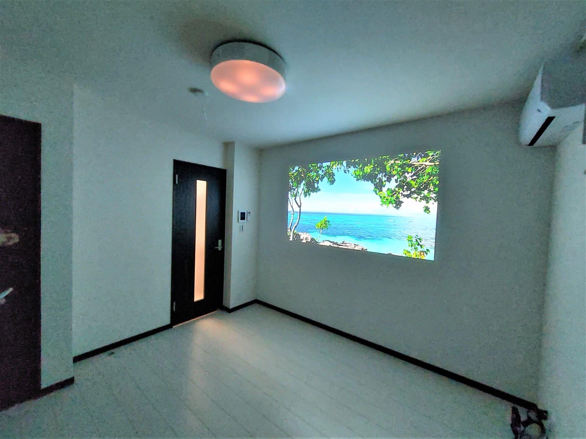 同物件は、JR総武本線「稲毛」駅から徒歩25分の場所にあり、千葉大学など、周辺に大学が点在していることから、学生をターゲットに設定。駅近ではない不利な立地を覆すために設備を充実させた。具体的には、宅配ボックスやスマートロック、防犯カメラ、テレビモニター付きインターホンなどの人気設備に加えて、約180万円かけてpopIn(ポップイン:東京都港区)の照明一体型のプロジェクター『popIn Aladdin(ポップインアラジン)』を全戸に設置。プロジェクター用のクロスを貼った壁の一面に、天井のプロジェクターから映画やテレビのほか、スマートフォンの画面を80インチの大きさで映し出すことができるようにしている。家賃は共益費込みで6万円。