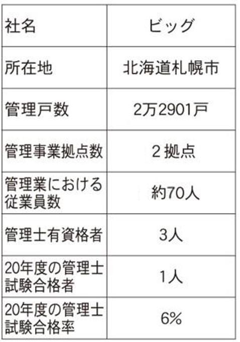 管理戸数2万2901戸(グループ全体)のビッグ(北海道札幌市)は、管理部門に所属する約70人を対象に資格手当を明示し管理士の資格取得を推奨している。効果は著しく、手当支給を開始した2019年は18年と比較して受験者が0人から20人に増加。