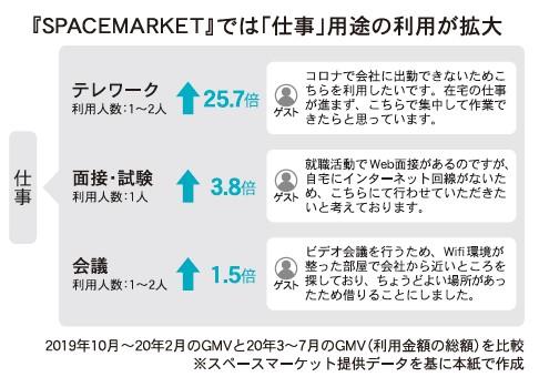 コロナ下で、時間貸しのニーズに変化が生まれている。スペースマーケット(東京都新宿区)が運営するレンタルスペースのマッチングサイト『SPACEMARKET(スペースマーケット)』では、ワークスペースの利用が増加。ワークスペースの掲載件数は、2020年8月に700件だったが、21年4月には3640件と約5倍に増えた。同サイトの総掲載件数は約1万5000件。