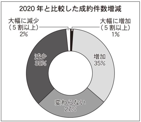 当社調査では、全体の成約件数は2020年の繁忙期と比べ「増加」と「減少」がそれぞれ35%、「変わらない」が27%となり、回答が3つに分かれた。