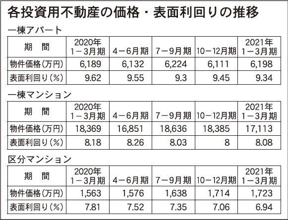 区分マンション最高平均額を更新と発表 ファーストロジック 統計データ|2021年05月21日 不動産投資サイト『楽待』を運営するファーストロジック(東京都千代田区)は4月15日、同サイトにおける投資用不動産調査の2021年1~3月期の結果を公表。区分マンションの価格が12年以降最高額を更新したことが明らかになった。 表面利回り7%切る 区分マンションの平均価格は、21年1~3月期で1723万円。20年1~3月期の1563万円よりも160万円上昇した。また、表面利回りも初めて6.94%と7%を切った。