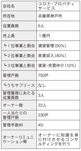 管理戸数750戸のコロナ・プロパティサービス(兵庫県神戸市)では、管理を受託しているオーナーに対して、賃貸経営に関する綿密なコンサルティングを行うことで他社との差別化を図っている。それが奏功して、年間100戸の管理戸数伸長につながっているという。