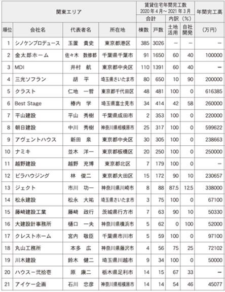 1位を獲得したのは、385棟3026戸のシノケンプロデュース(東京都港区)。会社員層を中心に、アパート経営の提案を推進している。同社のビジネスモデルは土地を仕入れて、アパート建築と合わせてサラリーマン投資家に販売するランドセットの手法だ。加えて、私募REIT(リート:不動産投資信託)であるシノケンリート投資法人に対して一棟販売している。