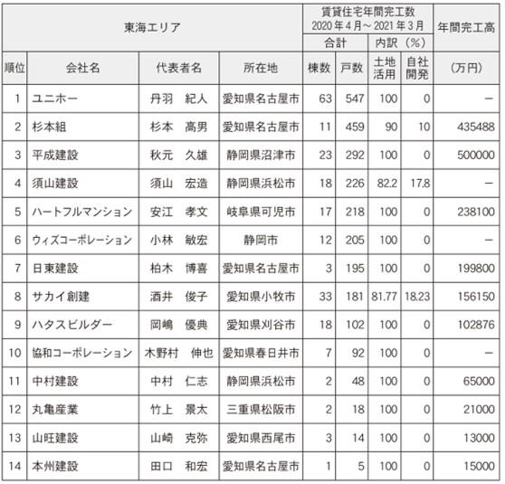 63棟547戸で首位に立ったユニホー(愛知県名古屋市)は、完工した物件すべてが土地活用だった。構造別に見ると、RC造が88.67%、木造が11.33%。間取り別では、1R・1Kが57.95%、1LDKが23.77%、2LDK以上が26.33%となっている。戸建ては40棟だった。