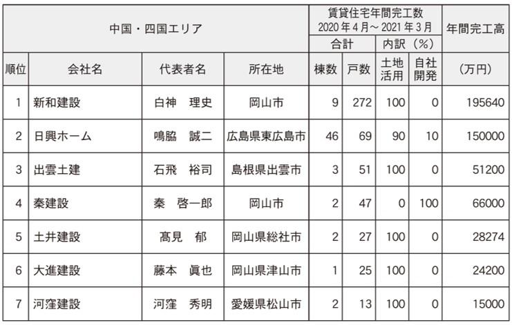 1位は9棟272戸の新和建設(岡山市)。完工高は19億5640万円だった。主に既存顧客からのリピート受注によって、2019年度の完工実績をキープした。3月末時点での受注残は8棟243戸。用途は土地活用が100%。構造はRC造が100%で、間取りは1R・1Kが76%、1LDKが24%となっている。