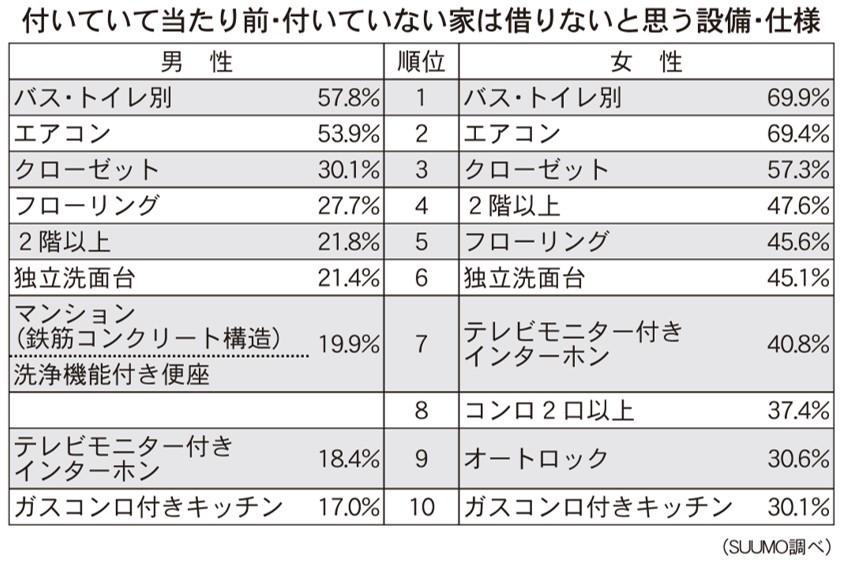 男女ともに、1位は「バス・トイレ別」、2位は「エアコン」、3位は「クローゼット」だった。また上位6位までは、順位の違いはあるが、内容は男女で同じとなった。