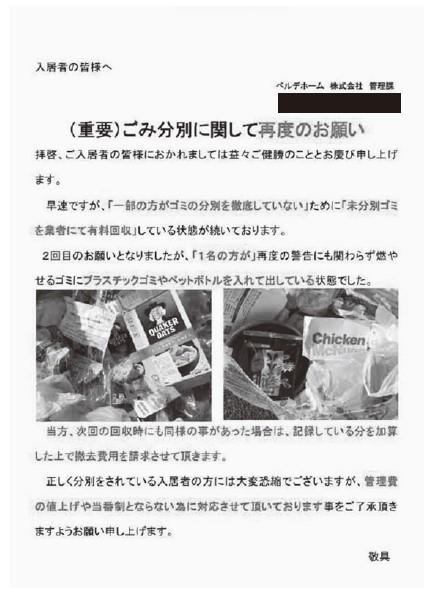 入居者からのクレーム、オーナーや管理会社の対応術 後編 ベルデホーム 管理・仲介業|2021年07月25日 ベルデホームの熊切部長は写真と共に書面で注意喚起 「上に住む人の音がうるさい」「ごみ置き場が汚すぎる」「設備が壊れたどうにかしてくれ」。賃貸住宅を運営する上で対応に苦慮するのが入居者からのクレームだ。「騒音」や「共用部ルール違反」などのシーン別にクレームの対応の事例紹介していく。 粘り強く張り紙で対応しゴミ問題を解決 【共用部利用】 未分別ごみ捨て注意を毎週通知 共用部は多くの入居者が使うため、トラブル対応にも難しさが伴う。特に解決しにくいのがごみ捨てのマナーだ。