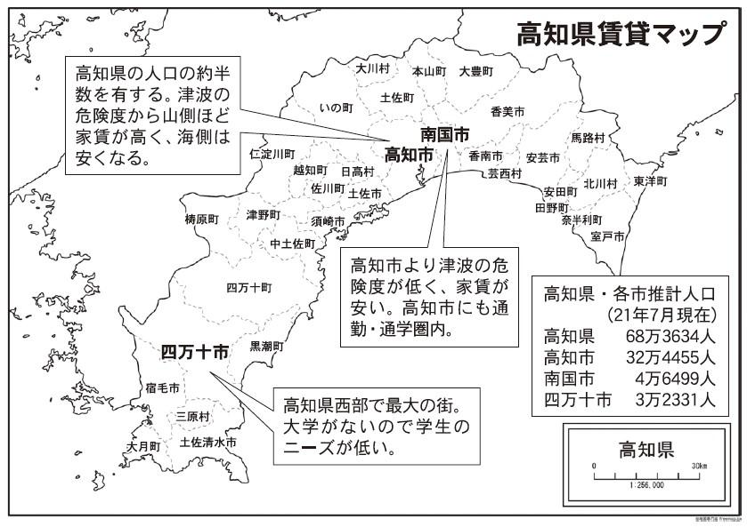 高知県は人口が68万3634人(7月時点)と全国47都道府県中45位。さらに県庁所在地である高知市に人口の約半数が集中している。年々、人口が減少する一方で毎年新築が増えており、入居物件と空室物件とで二極化が進んでいくだろうと関係者は話す。コロナ禍において、大きな変化を感じていない不動産事業者が多く、賃貸市況も安定している。