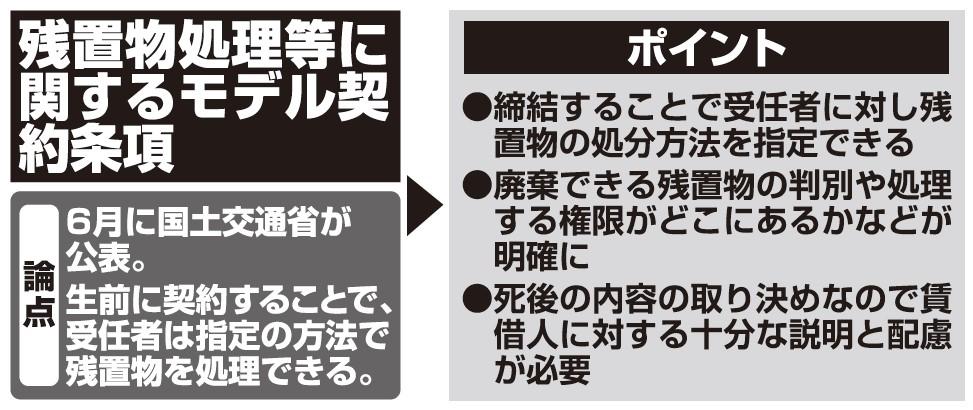 残置物の処分方法 【連載】新・法律エクスプレス 第13回 法律・制度改正|2021年08月27日 以前、私が賃貸していた物件の賃借人が、賃貸期間中に突然亡くなり、家族や知人がいなかったため、賃貸物件の明け渡しや残置物の処理に大変苦労しました。最近、高齢者の方から入居申し込みを受けましたが、家族や知 人がいないそうです。賃貸する際に、以前のような苦労をしないで済む方法はあるでしょうか。 生前の残置物関係事務委託契約で対応 賃貸借契約の中途において、賃借人が突然亡くなった場合、賃借人が利用していた日用品、家財道具などの動産類(以下、残置物)に対処したうえで、賃貸物件を明け渡してもらう必要があります。今回は、残置物の処分方法について見ていきます。