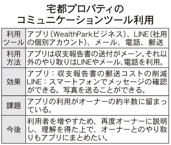 約3万戸を管理する宅都プロパティ(大阪市)ではWealthPark(ウェルスパーク:東京都渋谷区)が提供する管理会社向けサービスである「WealthParkビジネス」の機能の一つであるオーナーアプリの利用を促進する。