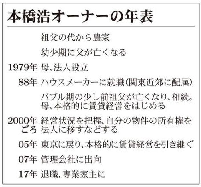 17年には、ついに専業家主となるべくサラリーマンを退職した。「本橋家の場合はたまたま男が自分だけで、土地は長男が継ぐものだという考えが強く、私が引き継ぐことになった。しかし、男女や生まれ順には関係なく、興味がある人、好きな人・向いている人が受け継ぐのが一番いいと思う。私はたまたま賃貸経営が向いていたのでラッキーだった」(本橋オーナー)