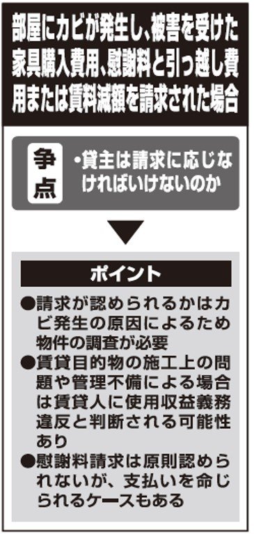 私は所有する物件を入居者に賃貸している者です。先日、入居者より室内にカビが発生したとの連絡を受けました。その後、入居者からは、カビの被害によって処分した家具の購入費用、処分費用、引っ越し費用、さらには慰謝料まで請求されています。また、引っ越し費用を私が出せないのであれば、賃料を減額するようにとも言われています。実際、このような請求には応じなければならないのでしょうか。