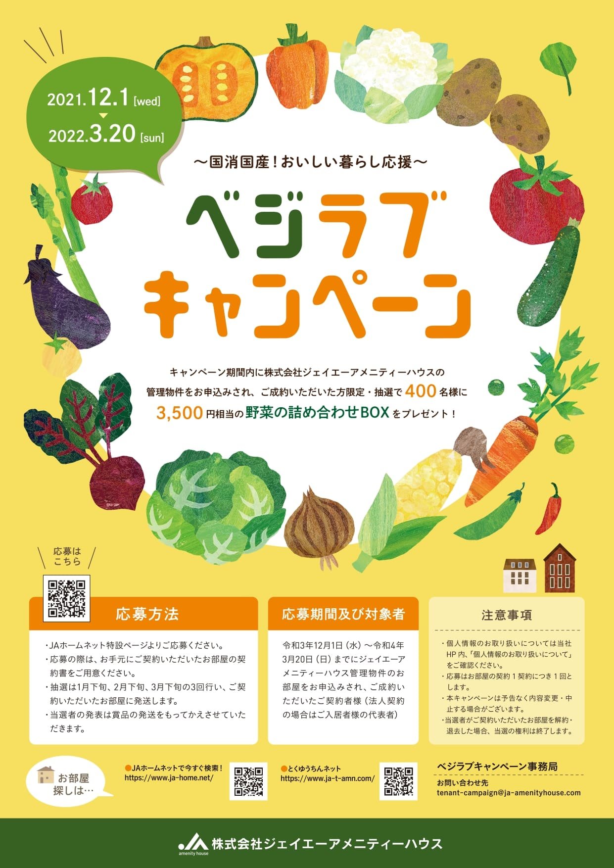 対象者は、12月1日~2022年3月20日の期間に成約をした新規入居者。キャンペーンは2種類あり、「おうちdeグルメセットプレゼントキャンペーン」については、同社グループの賃貸仲介窓口で成約した顧客向け。当選した30人は野菜の詰め合わせとスチームトースターをもらえる。もう一つの「ベジラブキャンペーン」は、同社の管理物件に成約した顧客全員を対象とし、抽選で400人に3500円相当の野菜の詰め合わせをプレゼントする。