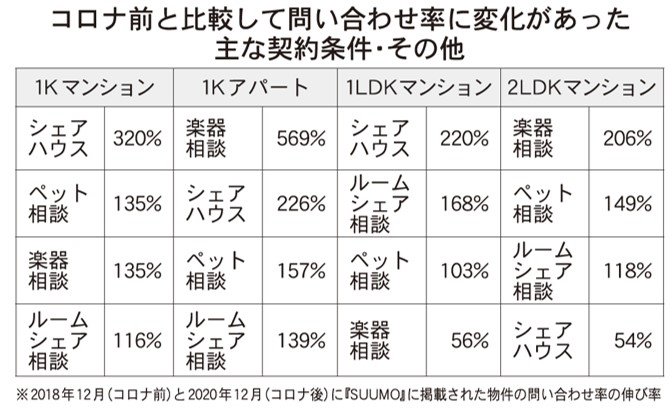 コロナ禍以降、日頃の行動で増えたことを聞いた調査によると、自宅でのエンターテインメント視聴やインターネット利用に関する項目が増え、一方で仕事関連や人と会う機会が減少している傾向が分かった。これを受けてか、賃貸住宅に求めるニーズも変化が生じている。『SUUMO(スーモ)』の掲載データによると、コロナ下、シェアハウス、ルームシェア可、ペット相談、楽器相談へのニーズが高まっている。
