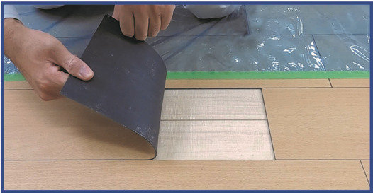 特長はビニール床タイルのほか、既設のフローリングやクッションフロアなどの上から重ね貼りが可能な点だ。市販のアクリル系水性接着剤の多くは接着剤自体が乾燥しないことから、重ね貼りや貼り替えができなかった。現状回復Fの場合、接着剤が乾燥した後に下地に貼り付くため重ね貼りができるだけでなく、接着剤の力でタイルが伸び縮みしないことから継ぎ目に隙間ができず、タイル同士の突き上げが起きにくい。下地を傷めないため、原状回復の際に傷ついた床材の部分だけ貼り替えることも可能だ。