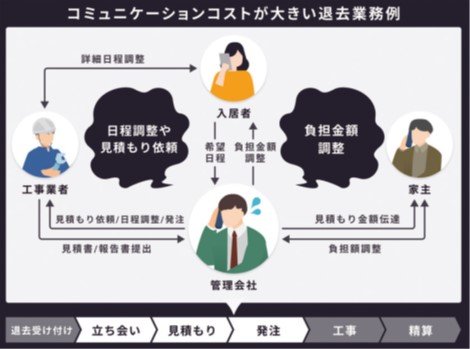 退去希望の連絡を受けると、退去申請書類の送付・回収、工事事業者への連絡、立ち会い、見積もり確認、家主との交渉、発注、仕上がり確認、精算、清掃事業者の手配など発生する業務は多い。そして更新と同じように「非対面」で「多方面」と電話やファクスでやりとりしているため、電子サービスをうまく活用できた場合、管理会社の生産性はもちろん、入居者や工事事業者の体験価値も上がる。