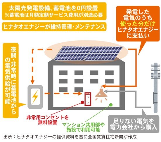 標準条件では、初期費用は無料で施工期間は通常5日程度。太陽光で発電した電気は原則として、共用部の電力として使用する。太陽光で発電して利用した料金を月々の使用料として、ヒナタオエナジーが徴収。余った電力に関しては、ヒナタオエナジーにて売電する仕組みだ。太陽光発電では足りない共用部の電力も別途ヒナタオエナジーと契約して調達することが可能である。利用料金は案件ごとに提案を行う。標準契約期間は20年で、期間内の保守・点検もヒナタオエナジーが行うため、メンテナンス費用は発生しない。非常時の防災性を高めるために蓄電池を併せたセットプランもある。