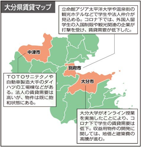 新型コロナウイルス下で47都道府県の賃貸住宅マーケットに及んだ影響を探る本企画。今回は九州の大分県だ。地場の不動産会社への取材では、留学生や観光関連の法人の仲介に苦戦していたことが分かった。ただ最近では、入国制限の緩和や日本人観光客の増加もあり、賃貸市況は変わりつつある。