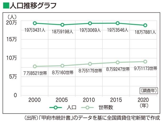 法人契約の減少に加えて、甲府市内から人口の流出が一部で進む。20〜30代のファミリー層は隣接する昭和町に、50代後半〜60代の団塊世代は同じく隣接する北杜市へ引っ越す動きが起きているという。