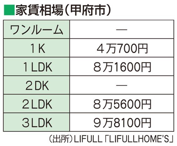 甲府市を中心に約6200戸を管理する甲府住販(同)によると甲府市の中心部は雇用が多いもの、中心部から離れたエリアに住むパターンが増えているという。家賃が安く、マイカーで中心部に通勤できるからだ。甲府市と比べ、中央市や甲斐市は家賃が甲府市の約7割、昭和町でも8割程度で済む。