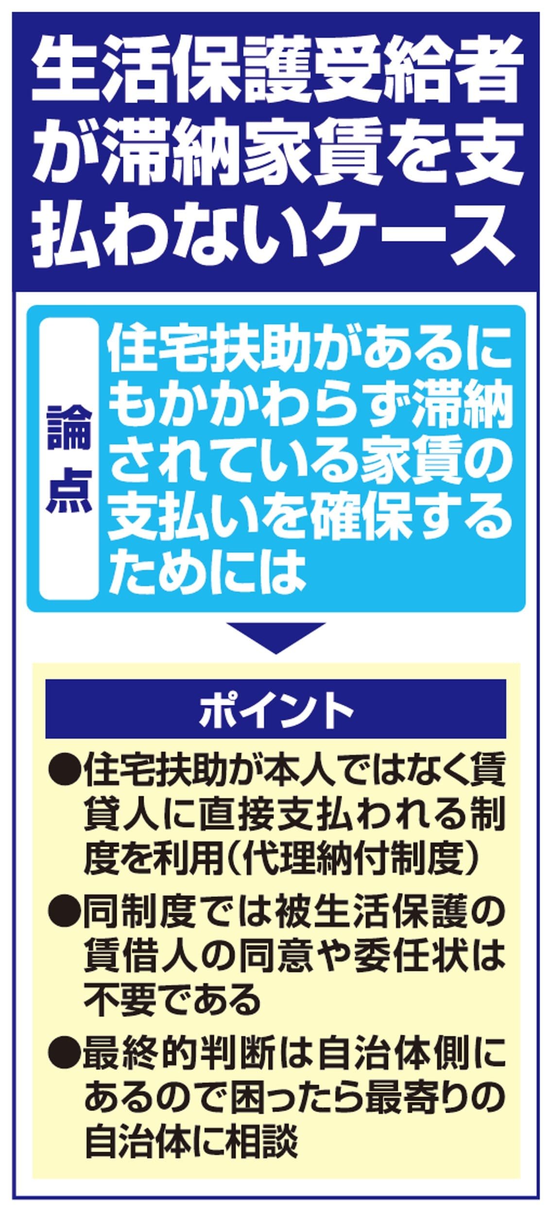 そこで、被保護者の家賃滞納を防止するための制度として規定されている、住宅扶助費の代理納付制度(同法第37条の2。以下、同制度)を利用することが考えられます。