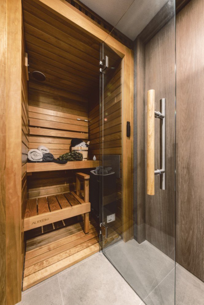 サウナを設置した住戸は2戸で、totonou Japan(トトノウジャパン:東京都渋谷区)が販売する北欧製家庭用サウナ「Auroom Cala Mini(オールームカラミニ)」を採用した。同商品は幅95cm、奥行き95cmで、設置面積は1㎡以内で済む。使用する木材には特別な加工を施し、水による腐食や経年劣化を防ぐ仕様だ。サウナにはベンチと電気ストーブを内蔵。室内温度は10分間で約85度となり、最大で110度まで上がる。設置場所の洗面所にはサウナのデザインに合わせ、鏡面の枠を木製にした。