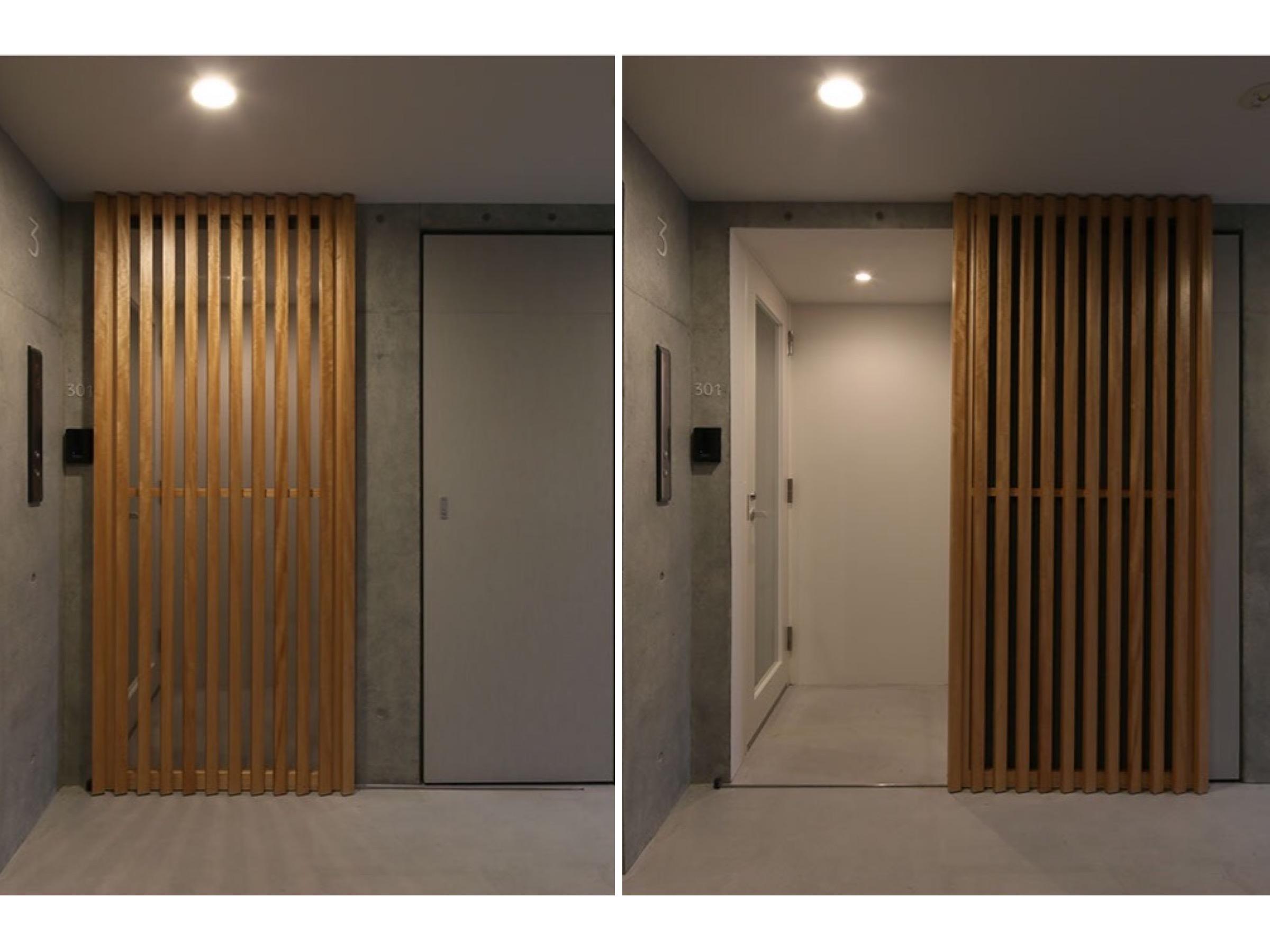 また建物の中央にある中廊下には、ルーバー部分の角度を変えて換気ができるジャロジー窓を南・北両方に設置し、風が通るようにした。さらに住戸の玄関手前にはロック機能を設けた網戸付き格子戸を採用。これにより玄関ドアを開けておけば、中廊下との風の流れが生まれる。