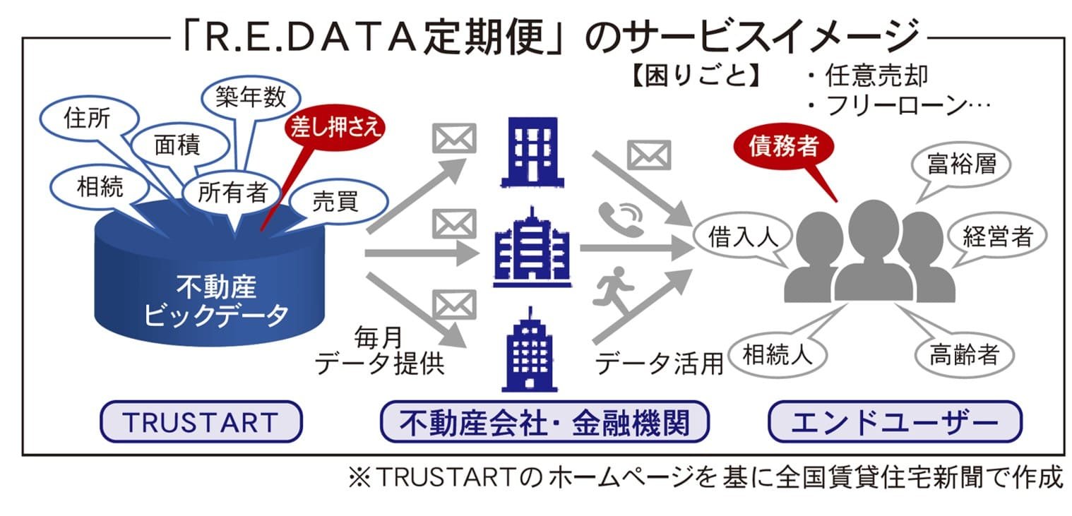 不動産調査事業を行うTRUSTART(トラスタート:東京都港区)は、不動産会社向けのデータ提供のサブスクリプションサービス「R.E.DATA定期便」の提供開始を7月11日に発表。15日からは、全国の不動産会社に向けサービス展開を開始した。