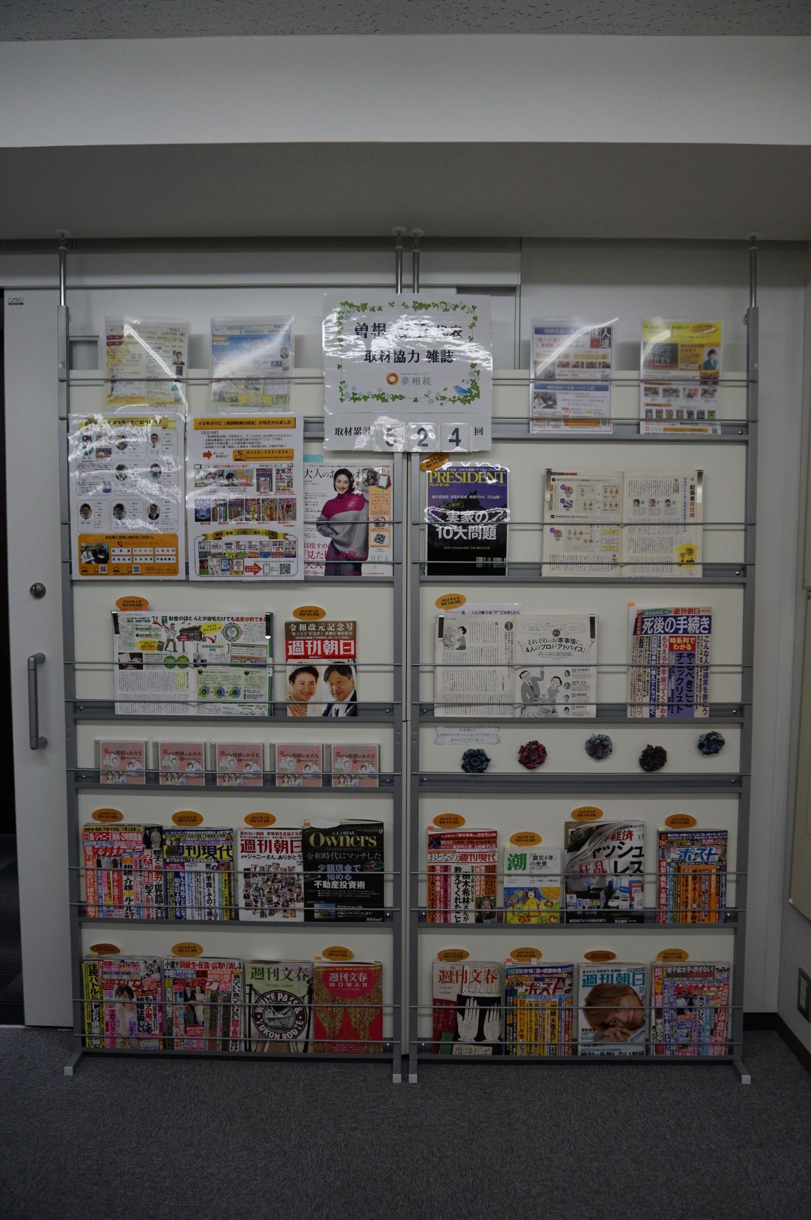 その取材に対応してきたことが少しでも来社された人にわかるように相談室にはこれまで取材してきた雑誌がずらりと並ぶスペースがある。数も随時更新。今後相続は注目されるだけあり、数の更新頻度は増えそうだ。